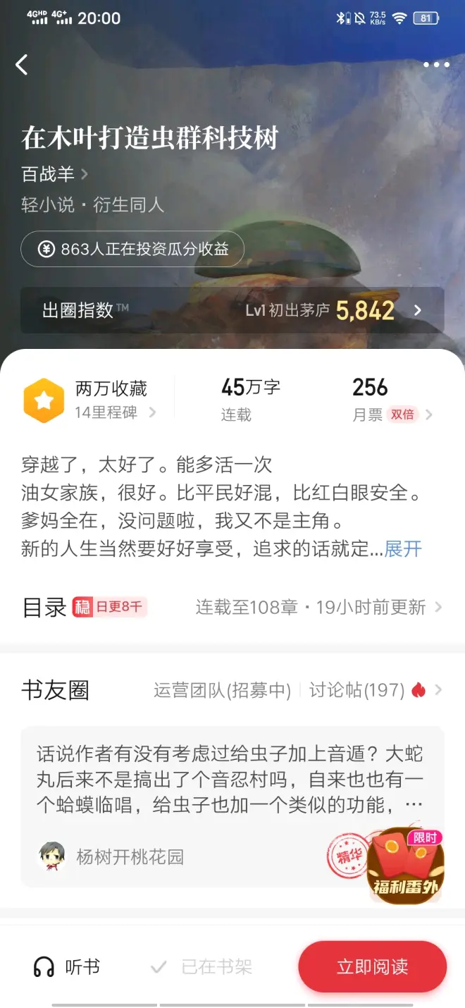 第七本:《在木叶打造虫群科技树》 我的评价是:憋屈。 送出糖蚁我是可以接受的,但是好处呢? 童测拿了个第一,优待呢? 什么都没有,憋屈。 然后一直在压战力,等着上架,行吧。 但是上架的爆发又没爽到哪里去。 再加上作者一直写一些比较危险的比喻。 我愿称之为云文青。
