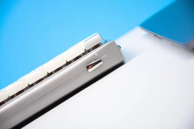 杜伽Hi Keys,支持蓝牙+2.4G的连接模式,模式切换按键采用了镀铟拨档开关,可以快速在几个模式下进行切换。