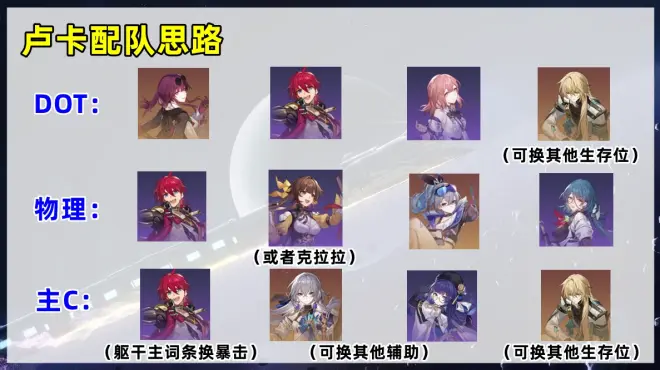 卢卡配队思路主要有三种:1.dot流,推荐配队卡芙卡+卢卡+艾丝妲+罗刹(或其他生存位);2.物理流,推荐配队卢卡+素裳/克拉拉+娜塔莎+银狼;3.主C流,当成常规输出主C培养,最好是在dot流的遗器基础上换回暴击躯干,保证一定直伤,推荐配队卢卡+布洛妮娅+佩拉+罗刹,布洛妮娅和佩拉可换其他辅助,罗刹同理。