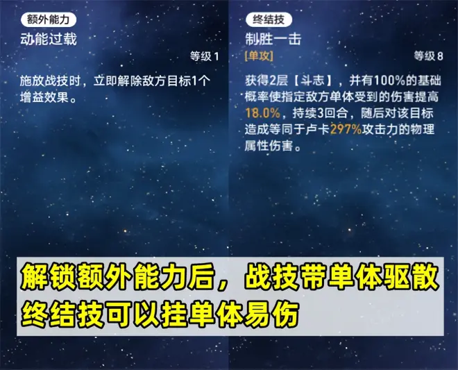 不过这还没完,卢卡的终结技能给敌方单体挂上易伤状态;而在解锁额外能力“动能过载”后,战技还能解除敌方单体1个增益效果,也就是俗称的“驱散”。所以卢卡不仅有伤害和dot机制,他还有一定的功能性,使得他能在不少队伍中发挥作用。