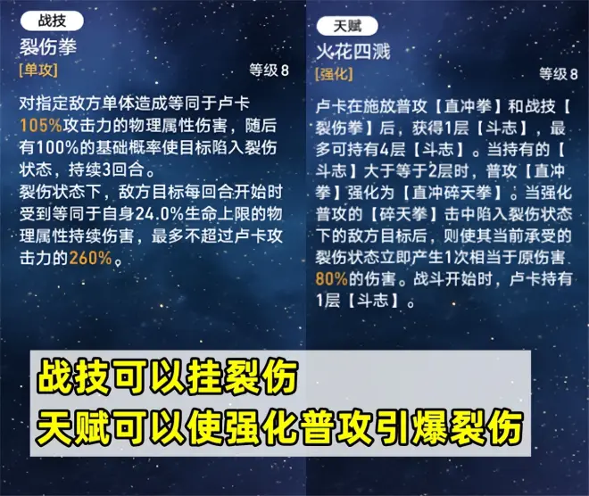 卢卡的技能机制很有意思,一方面他有名为“斗志”的叠层机制,由终结技和天赋效果触发叠层,斗志大于等于两层时普攻会变为段数更多的强化普攻。另外,战技可以挂裂伤状态,天赋则可以使强化普攻引爆裂伤,乍一看他像是对单有一定输出的dot角色。