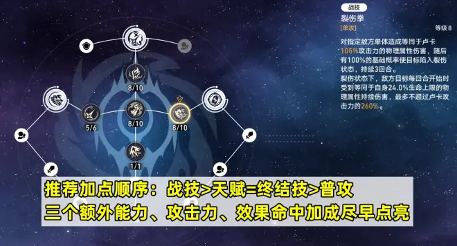 推荐加点顺序:战技>天赋=终结技>普攻。战技升级可以提升技能裂伤倍率,天赋升级提升引爆裂伤倍率,终结技升级为了提高易伤比例,普攻和裂伤倍率无关所以可以不升。行迹方面,推荐三个额外能力以及后续的效果命中、攻击力加成都点亮。