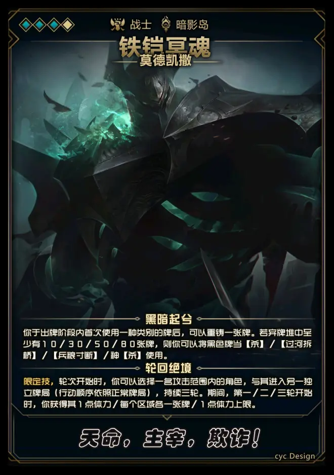 注:一技能的“通过这些牌发动〖君命已决〗”指的是:用一张以此法获得的英雄牌替换佛耶戈直到本回合结束,(将手牌摸至三张),回合结束时将此英雄牌销毁。