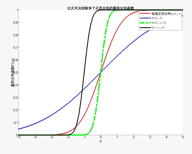 我们用北太天元的normcdf 函数计算不同正态分布的累积分布函数,展示如下