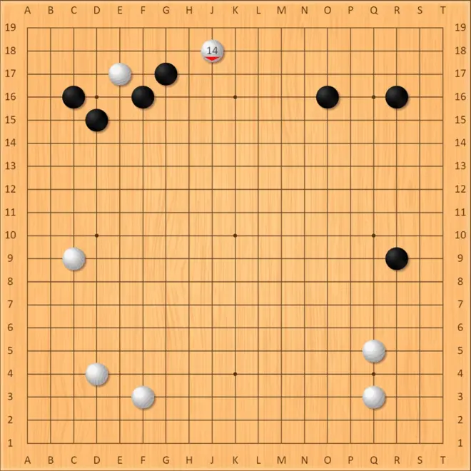 白14是左上定型后白棋的后续好点,黑棋大致需要在J17靠住或者像实战中H16虎一个补棋,否则遭白棋G18托,黑棋无法搬下,角上小飞挂角一子被救出,黑棋实地损失很大:
