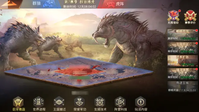 新赛季为四服匹配玩法,一个强服匹配三个弱服,强服称为“虎阵”,弱服称为“狼群”,仅有同阵营下的军团可缔结盟约。王国分部上,强国在中心,弱国分布在四周。七级关隘为全开放关隘,虎阵王国可入侵到群狼王国的安全区,群狼需守护好7级关隘。