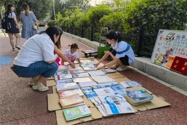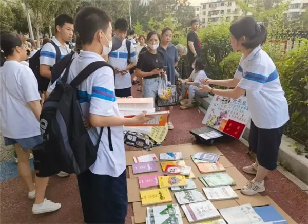 书摊的主人是该校刚刚结束中考的王乙丁同学,她正在向学弟学妹和家长们热情介绍教辅资料,这些都是她筛选出来的初中重点学习资料,每一本都是她曾经认真研读并且从中获得了很多进步的“秘籍”,她希望她的“秘籍”可以为更多学弟、学妹们传授经验,帮他们更好地应对学习过程中可能出现的问题。