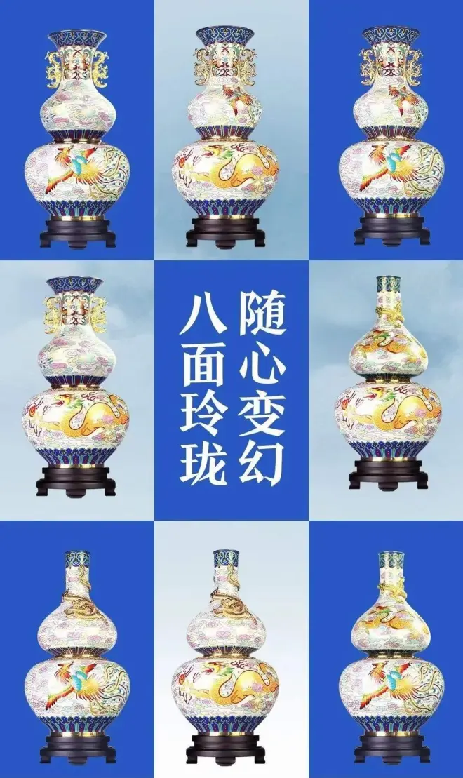 包括“天龙福瓶”(创意源于“瓶中三宝”的“玉壶春瓶”);“鸾凤和瓶”(以康熙御制的“凤尾瓶”为原型创制),和“坤泰财缸”(取自紫禁城三大殿之首的“泰和殿”门前的大铜缸为原型创制)。三尊景泰蓝,经两两组合,可嵌套成两个葫芦尊。一套《天和尊》,“蝶变”出三器五型,五种用法,颠覆了人们对景泰蓝的固有认知,为景泰蓝的形制创新拓展出了的更多可能性。