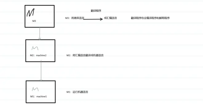 与人类描述问题的方式很相似。M1无法识别高级程序语言,我们先将高级语言转换成汇编语言然后再转换成机器语言。我们将 高级语言翻译成汇编语言的机器称为虚拟机M3