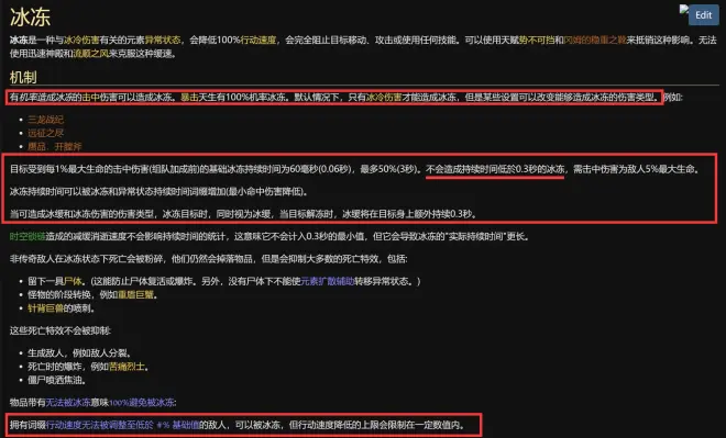 第二点,冰冻问题。首先,85王是可以打出冰冻的,如果对此有异议的朋友,可以移步编年史对冰冻这一词条反复观看:“拥有词缀行动速度无法被调整至低於 #% 基础值的敌人,可以被冰冻,但行动速度降低的上限会限制在一定数值内。”