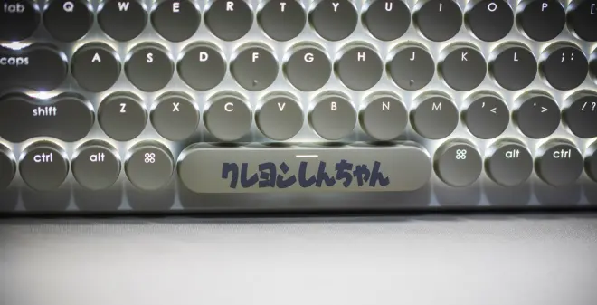 作为联名款,整个键盘基本上到处都透露着和蜡笔小新相关的元素,比如顶部的14个键帽,就是小新各种的表情包,这个对于任何人应该都没有抵抗力的。加上其他的大键的字幕和符号元素点缀等等,是个整个圆点键盘看起来很协调。