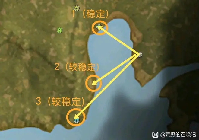 普通区域三 种群数量:多 视野情况:一般 推荐指数:中 西部梅花鹿海岸,两个出发位置,1号不稳定点位较为容易观察。如图往北一路游猎即可,缺点是反斜坡和草很多影响观察。点位跳跃性也很大,个人建议根据自己图点位摆三脚架即可。