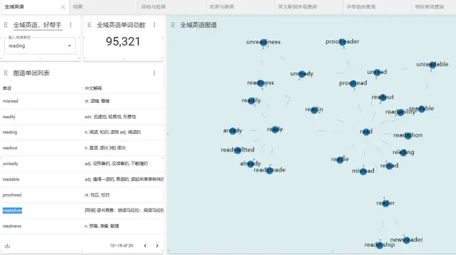 只要输入任何一个单词,例如feeling,系统会自动查找所有存在构词规律的单词,并以图谱的方式进行展示,构词规律一目了然,而且你还能知道在哪一年,出现在什么考试中(包含高中、四六级和考研)。