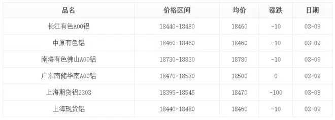 3月9日,铝价格近日范围呈现下降趋势,总体来讲下,下降幅度波动范围比较大,各地区的具体的铝价格涨跌幅情况如下图,其中长江有色A00铝的均价18460吨,上升-110元/吨;中原有色铝的均价为18460元/吨,上升-10元/吨;南海有色佛山A00铝的均价为18780吨,上升-10元/吨;广东南储华南A00铝的均价为18500元吨,上升0元/吨;上海期货铝2106的均价18470元/吨,上升-100元/吨;上海现货铝的均价为18460元/吨,上升-10元/吨。