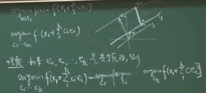 为了不用导数,用{e1,e2,...en}构造一个线性子空间,f在S1,S2中的最优解x1*,x2*组成的向量x1*-x2*与{e1,e2,...,en}共轭(线性子空间性质)。f在S1中求最优解x1的问题可以变为在S中求最优解{c1,c2,...,cn}的问题,而此问题可化为对单个c求解的问题(上图最后一行)。