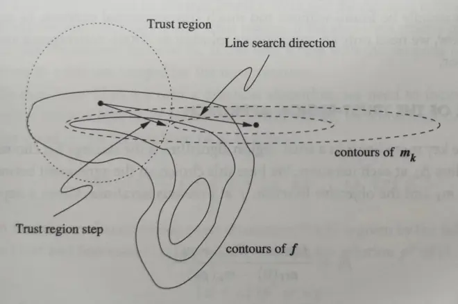 信赖域方法在当前的迭代定义一个区域,在此区域内能够相信(trust)模型可以充分代表目标函数。然后选择步(step)作为当前区域的近似极小值点。