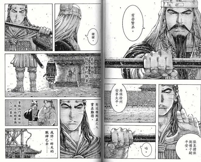 对应点:漫画中,战神,指曾一度叱诧风云的吕布,而武圣,自然就是关羽。张辽感慨“武圣的年代来临了”,对应的是关羽的名声并没有伴随着后来身死或者蜀汉政权的灭亡而随之消失,相反,后来关于成为了一种民间信仰,名声与地位在中国与日俱增,为佛、道、儒三门崇信,民间奉尊为“武圣”,道教奉为“关圣帝君”,佛教称为“伽蓝菩萨”,甚至被商人奉为财神。及至今日,关羽的忠义与武勇也仍然为人们铭记。