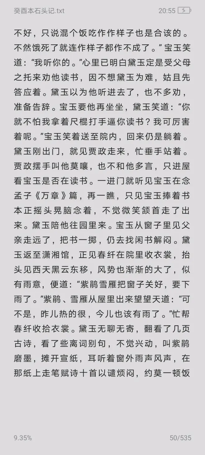 原著第8回:李嬷嬷道:“你可仔细老爷今儿在家,提防问你的书!”[甲戌侧批:不入耳之言是也。甲戌双行夹批:不合提此话。这是李嬷嬷激醉了的,无怪乎后文。一笑。]宝玉听了这话,便心中大不自在,慢慢的放下酒,垂了头。黛玉先忙的说:“别扫大家的兴!舅舅若叫你,只说姨妈留着呢。这个妈妈,她吃了酒,又拿我们来醒脾了!”[甲戌侧批:这方是阿颦真意对玉卿之文。]一面悄推宝玉,使他赌气;一面悄悄的咕哝说:“别理那老货!咱们只管乐咱们的。”那李嬷嬷也素知黛玉的,因说道:“林姐儿,[甲戌侧批:如此之称似不能通,却是老妪真心道出。]你不要助着他了。你倒劝劝他,只怕他还听些。”林黛玉冷笑道:“我为什么助着他?我也不犯着劝他。你这妈妈太小心了,往常老太太又给他酒吃,如今在姨妈这里多吃一杯,料也不妨事。必定姨妈这里是外人,不当在这里的也未可知。”李嬷嬷听了,又是急,又是笑,[甲戌侧批:是认不得真,是不忍认真,是爱极颦儿、疼煞颦儿之意。]说道:“真真这林姑娘,说出一句话来,比刀子还尖。你这算了什么呢!”
