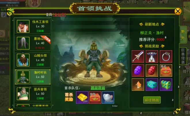 首领挑战总共有八个不同的首领,每个首领所在位置不同,挑战的首领等级越高,获得的奖励越好。