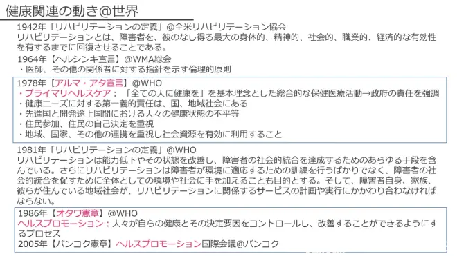 ヘルスプロモーションとは、WHO(世界保健機関)が1986年のオタワ憲章で提唱し、2005年バンコク憲章で再提唱された、人々の健康の維持、増進のための活動・戦略のことです。