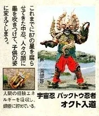 属于宇宙人忍者集团的“还童忍者”,是过去毁灭87个星球的实力者。通过向对象脸上喷墨来夺取“经验能量”的宇宙忍法,将椎名鹰介(破里剑红)变成了孩子的模样。引导出的经验能量做成糖球保存在章鱼罐里。爱吃的是腌珊瑚。