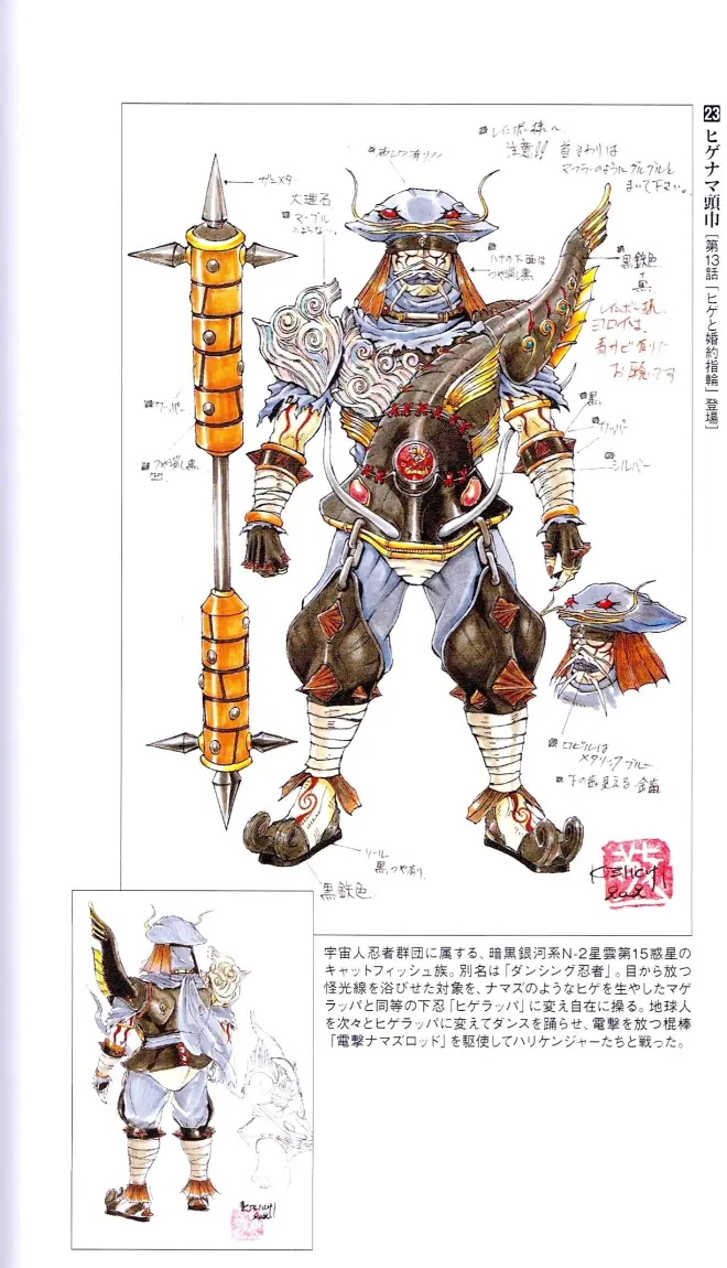 属于宇宙人忍者群体,黑暗银河系N-2星云第15行星的卡特菲什族。别名是“舞蹈忍者”。将从眼睛放出的怪光照射的对象,变成长着鲶鱼一样胡须的发髻喇叭和同等的下忍“玛咯啦帕”可以自由操纵。把地球人一个个变成胡子喇叭让他们跳舞,使用能放出电击的棍棒“电击鲶鱼棒”与破里剑者们战斗。