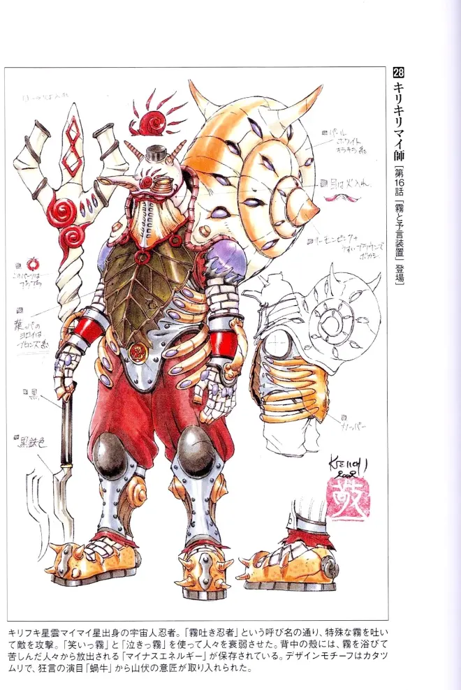 基里夫基星云麦伊麦伊星出身的宇宙忍者。正如“吐雾忍者”这个称呼一样,能吐特殊的雾攻击敌人。使用“笑雾”和“哭雾”使人们衰弱。背上的壳保存着被雾所困扰的人们释放出来的“负能量”。设计主题是蜗牛,从狂言剧《蜗牛》中汲取了山伏的设计。