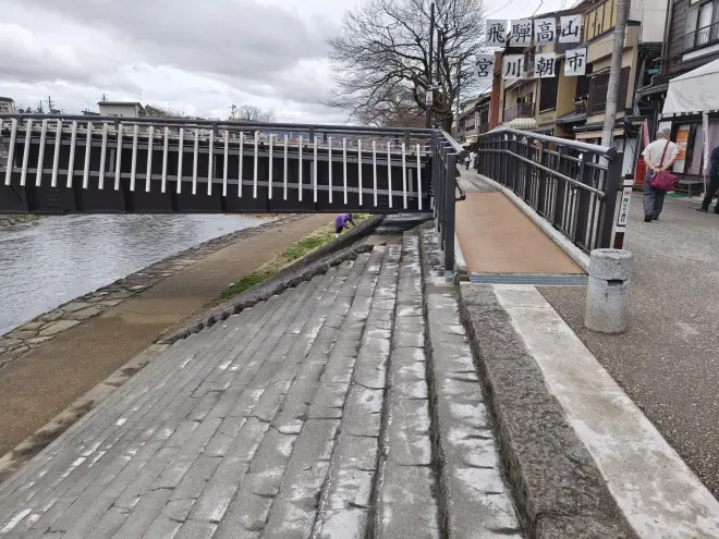 宫川的西岸紧贴着商店街一侧的商铺旅舍,几乎没有能在河堤之上行走的路,于是打算先沿着东岸走过去。这时大概八点多一点,宫川朝市开始热闹起来了,实话讲作为高山市的重要景点之一,这个市场颇有国内小吃街的风范,土产零食纪念品的小摊不一而足,已经完全变成招揽游客的形状了。