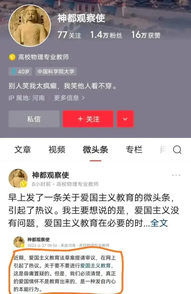比如,也有高校老师跳出来反对,他认为爱国情怀不是靠教育出来的,是一种发自内心的本能行为。
