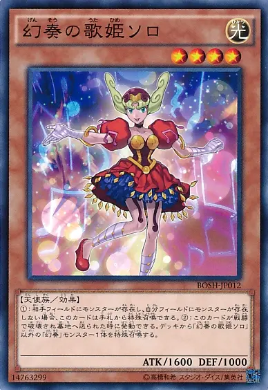 ②:这张卡被战斗破坏送去墓地时才能发动。从卡组把「幻奏的歌姬 索萝」以外的1只「幻奏」怪兽特殊召唤。