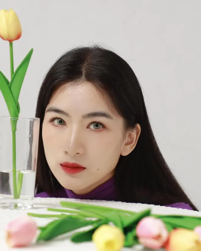 在写真中,龙怡利以香芋紫色针织衫搭配黑长直发出境,颜色鲜艳,妆容自然,眉眼精致。龙怡利手持玻璃杯,目视前方,眼波流转、舒缓安静,在配上一旁的彩色郁金香,整个画面轻松俏皮,满满多巴胺元素,让人看了都快乐。