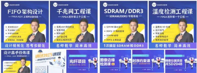 明德扬推出一系列FPGA精品专题视频课程,包括高手修炼课、实用试技巧课、FIFO 架构设计课、温度检测工程课、边缘检测工程课、SDRAM/DDR3 、千兆网工程课、时序约束专题课等,主要针对掌握了一定FPGA基础的FPGA学习爱好者,课程统称为“明德扬FPGA进阶课”,除了包括上面提到的八大项,还有两项“光纤项目工程”和“精密仪器项目JESD204B”属于企业级项目,可以自由选择掌握,前面的属于FPGA开发中必须掌握的技能,掌握技能可快速提速开发能力。当然,也可以自由选择学习知识点,根据个人的实际情况选报提升。每一个专题都是干货满满,有对应的学习主题、丰富的学习内容,明确的学习目标,以及作业安排。具体的模式是:视频课+进群答疑,更多详情进一步了解可下播后咨询老师。