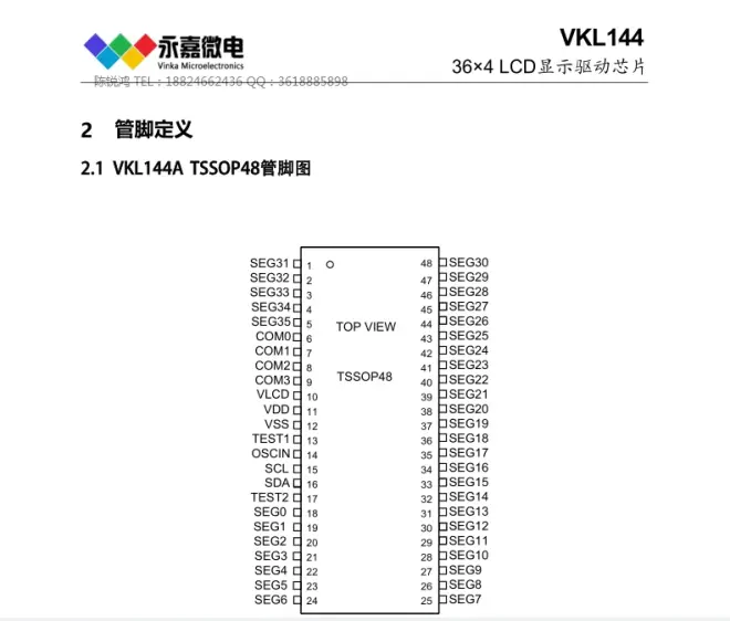 VKL144A 2.5~5.5V 36seg*4com 偏置电压1/2 1/3 I2C通讯接口 TSSOP48超低功耗/抗干扰
