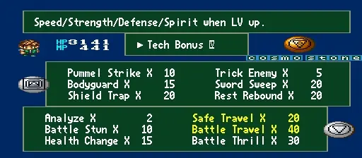 不遇敌金手指 7E00BE=00 特别提醒,这个游戏前中期大部分boss都需要练级才能打,不存在什么技巧。或许到了中后期学了强力技能和有了反射铠甲或特技,一些战斗能够稍稍巧胜。不过练技能其实也跟练级差不多,依旧是要练功。玩了一遍目前我能想到的较快练技能方法是初期在妈妈岛多买一些战后石头x2的酒,然后每逢打boss都吃一个。路上碰到出外星人小怪的地方也可以适当刷刷,末期就配置双倍石头的技能到亚特兰蒂斯的地洞刷。 若是快速通关的话,个人推荐以下几个角色技能组合: 女主自动复活和死后命令