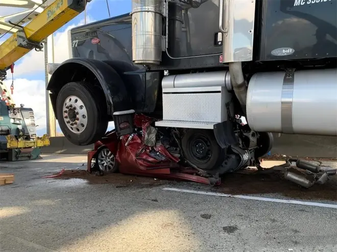 美国华盛顿的一位46岁的妇女驾驶的日产小轿车,遭到一辆大货车的碾压,但她却奇迹般的活了下来,当吊车把货车挪开之后,女司机自己从碎片中爬了出来,当场表示自己只是头有点痛。