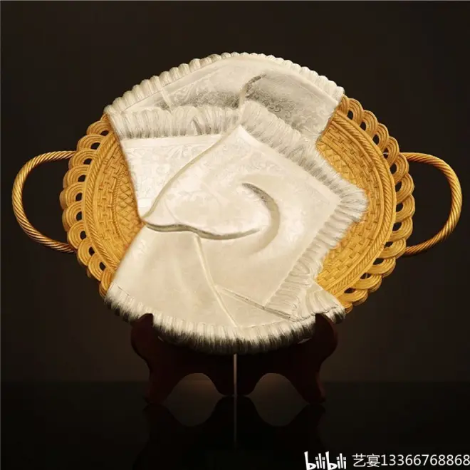 《和美》纯银丝巾果盘《和美》纯银丝巾果盘造型仿制于中国传统的竹编果篮,其上披一条柔软的江南丝巾,四足则为由银丝编制的具有中国特色的中国结造型。宝相花图案、卷草纹图案寓意富贵吉祥、福运延绵。“和美”之意源自“以和为美”的思想,也象征着各经济体携手编织世界经济网的共同愿望。寓意着2014年APEC会议的圆满举办将会为世界各国带来丰硕成果的美好愿景,也象征着各国携手编织世界经济网的共同愿望,该礼品展示出了中国传统工艺璀璨的魅力,是承载中国民族文化精神的精美礼物。