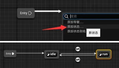 2、我们需要在动画蓝图中设置一个状态机 static machine,状态机里面,通过判断移动速度,设置idle和run两种状态的切换