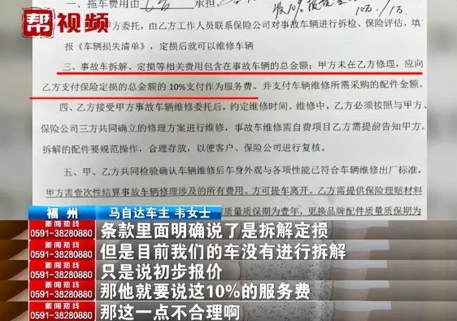 事故当天,韦女士和车上人员到医院做了检查,所幸身体并无大碍。韦女士说,刚出医院大门,4S店的工作人员就找她签了一份维修协议书。