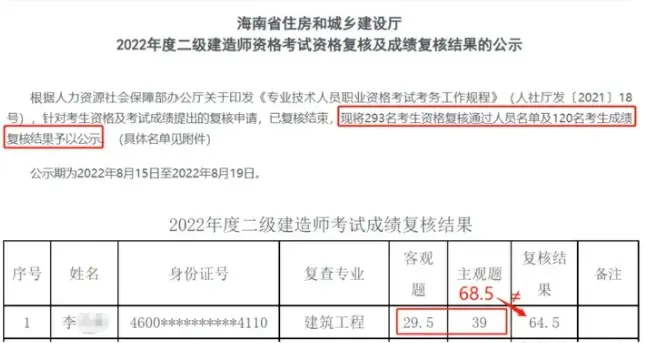 这位二建考生复核前客观题29.5分、主观题39分(总分应为68.5),复核后总分变为64.5。一个月后,海南公布22年二建合格标准:建筑科目65分……造化弄人!二建考后成绩复查都有规定时间,当初的报名文件里一般都有提及。如果对成绩有异议,记得在规定时间内提出申请,逾期不再受理。