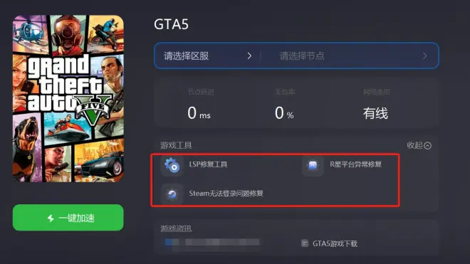 GTAOL的下载途径有许多种,虽然最正规的方法还是从R星官网进行最好,但难免有些同学会通过第三方渠道去进行下载,此时就会导致有些网 络配置文件受损,导致在游戏过程中突然出现掉包率上升和延迟骤增的情况,此时就可以在海 豚加速工具中点击【LS修复工具】,几秒钟的时间就能修复好。