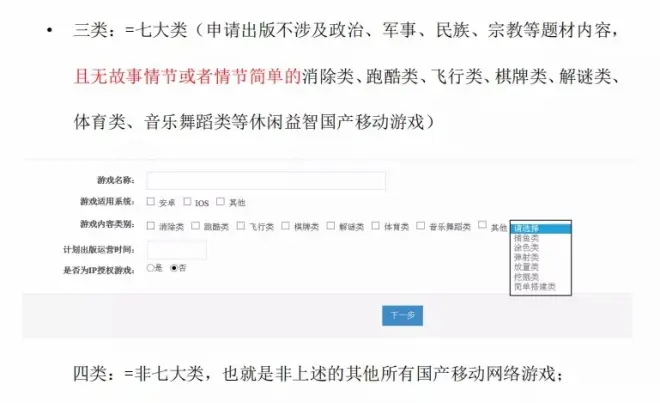 三类:=七大类,即申请出版不涉及政治、军事、民族、宗教等题材内容,且无故事情节或者情节简单的消除类、跑酷类、飞行类、棋牌类、解谜类、体育类、音乐舞蹈类等休闲益智国产移动游戏。三类游戏指的是《关于移动游戏出版服务管理的通知》(以下简称《通知》)中第三条列举出的消除类、跑酷类、飞行类、棋牌类、解谜类、体育类、音乐舞蹈类等移动游戏申请审批类别,也对应着上文提到的网游审批信息名单中“移动-休闲益智”这一申报类别。