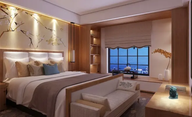 驼色的立面带来素静的氛围,实木几何地板错落有致的铺贴出温实感;床品深浅适度,混搭出现代大气,而床尾凳的白色与地毯的素雅构成柔和与温馨;花鸟图案的背景墙,将文艺风携入室内,温情无限。