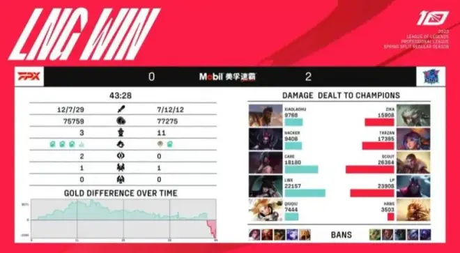 坦率地讲,第二局比赛FPX可惜了,他们在比赛初期,凭借林炜翔的出色发挥,在下路连续打出线杀,林炜翔连续拿到三个人头后,FPX在前10分钟,就取得了近3K的经济优势。按照常理推断,这个时候的4K经济优势,已经足够一支普通队伍,轻松的完成压制,滚起雪球了。