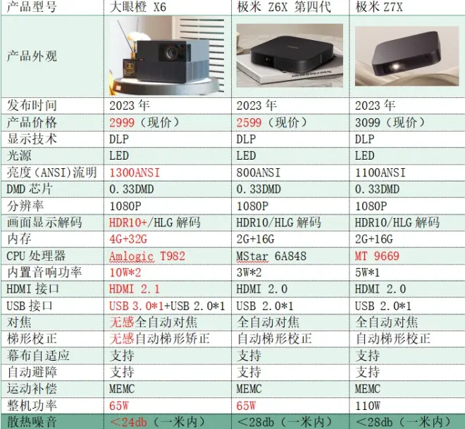 2亮度:大眼橙X6为1300ANSI流明,极米Z6X 第四代为800ANSI流明,极米Z7X为1100ANSI流明。