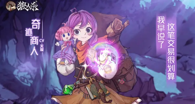 奇迹商人是一名背着巨大魔法口袋的小女孩,她随身携带与她模样极其相似的玩偶。除此之外,守卫的光辉结界、预言家的命运之眼、女巫的致命毒药,所有狼人杀的神职的随身物品都被挂在她的腰间。