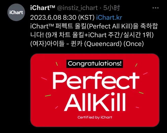 韩国时间2023年6月8日8:30,(G)I-DLE新曲《Queencard》达成iChart Perfect All Kill!历经十几天的VIBE日榜卡二后,《Queencard》终于还是迈过了《I AM》这座大山,成功登顶。