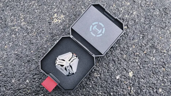 扑面而来的赛博机甲风,在一个三角形里镂空一部分出来,做了机械转轴结构,是不是很像那种指尖陀螺?整体上采用了锌合金的材质,这种材质易铸造复杂、薄壁的部件,而且表面光滑,还很耐磨,GX05的颜色上金属质感极强,在两个支架顶部也刻上了logo和Flash Speed这项技术名称,看起来应该是又二次加了电镀、喷涂等工艺来增加手感。