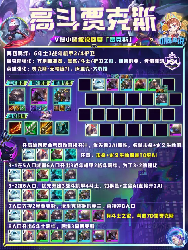 因此当前版本优先开出6斗士3战斗机甲或者5战斗机甲4斗士羁绊,高斗性价比会更加高,能够让贾克斯叠攻速,除非有战斗机甲纹章,否则不建议开5战斗机甲。