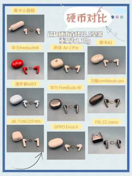 已知一枚硬币重量为1.15g,大家可以根据每款耳机的实际重量,结合硬币来进行比较。实际测试下来,佩戴表现优秀值得推荐的有:南卡小音舱,华为FreeBuds 4E,FIIL CCnano。