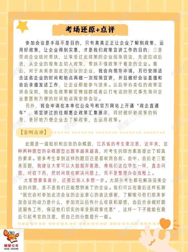 ✍我的第三点建议是——脑补情景细节,展开自己的想象。无论是组织计划题,还是应急应变题,再或是人际关系题,都有很多题目线索不明确的点,大家需要做的是把不明确的要素明确出来,防止含糊不辞。
